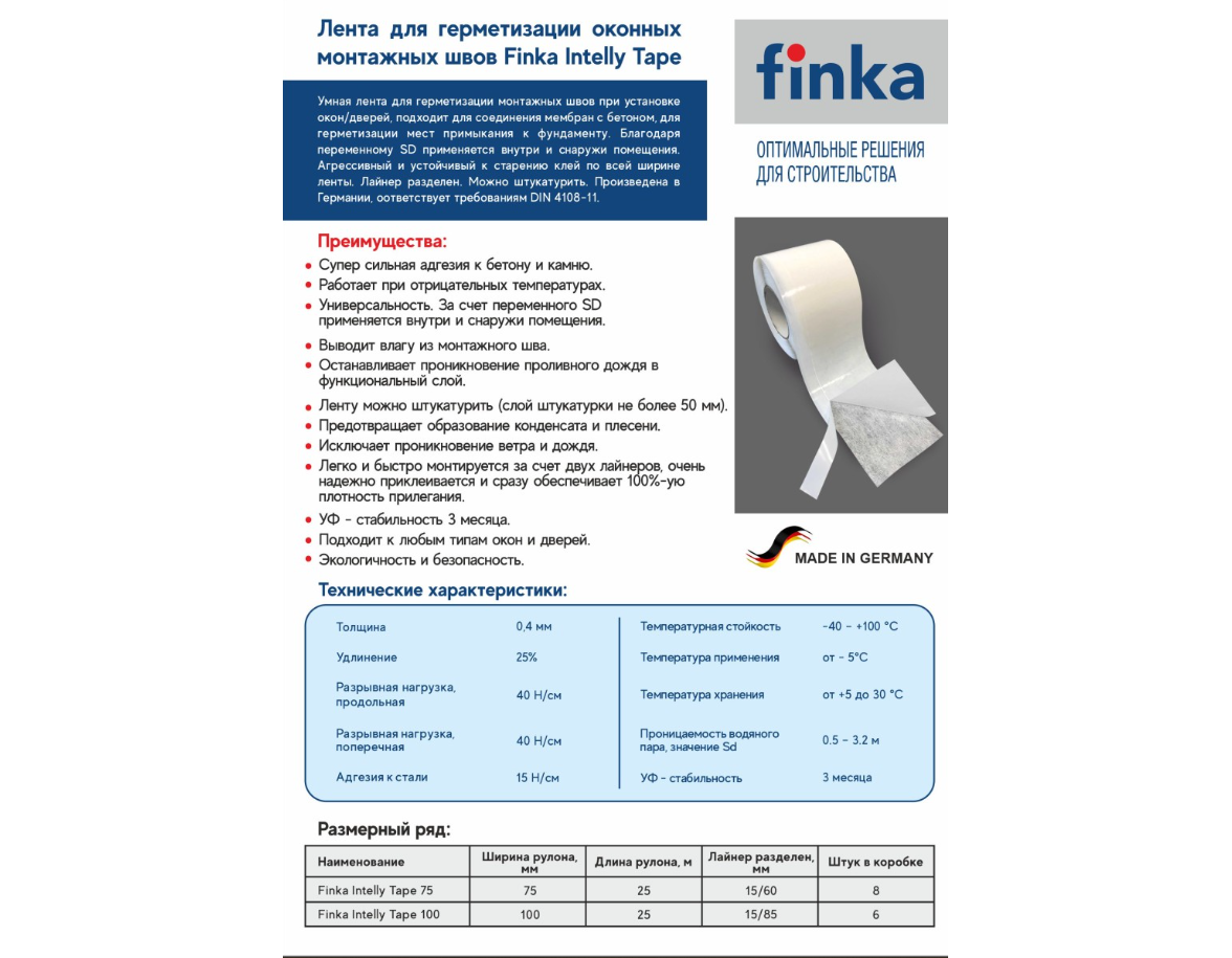 Лента для герметизации оконных монтажных швов Finka Intelly Tape. Лента для герметизации монтажных швов при установке окон/дверей, подходит для соединения мембран с деревом, бетоном, герметизации мест примыкания к фундаменту. Благодаря переменному SD применяется внутри и снаружи помещения. Агрессивный и устойчивый к старению клей по всей ширине ленты. Лайнер разделен. Можно штукатурить. Произведена в Германии, ответствует требованиям DIN 4108-11. Преимущества: • Супер сильная адгезия к дереву, бетону и камню. • Работает при отрицательных температурах. • Универсальность. За счет переменного SD (0.5 - 3.2 м) применяется внутри и снаружи помещения. • Выводит влагу из монтажного шва. • Останавливает проникновение проливного дождя в функциональный слой. • Ленту можно штукатурить (слой штукатурки не более 50 мм). • Предотвращает образование конденсата и плесени. • Исключает проникновение ветра и дождя. • Легко и быстро монтируется за счет двух лайнеров, очень надежно приклеивается и сразу обеспечивает 100%-ую плотность прилегания. • УФ - стабильность 3 месяца. • Подходит к любым типам окон и дверей. • Экологичность и безопасность. Количество в упаковке: 8шт Размеры упаковки: 0х0х0мм Объем упаковки: 0,00м³ Вес упаковки: 0кг
