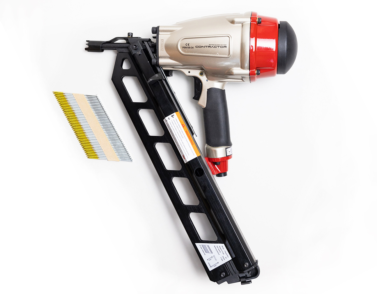 Компрессорный нейлер, работающий в диапазоне давления воздуха от 6 до 8атм. Используемые гвозди - каркасные реечные 34°, длиной от 50 до 100мм, с диаметром стержня от 2,8 до 3,4мм и шляпки - 7мм. Оснащен зубчатым носом, шестигранником для регулировки глубины забивания, работает в контактном режиме ("в отбой"). Гарантия: 1 год с момента продажи. Бренд: CONTRACTOR™ Страна производства: Китай Вес нейлера: 4.2кг